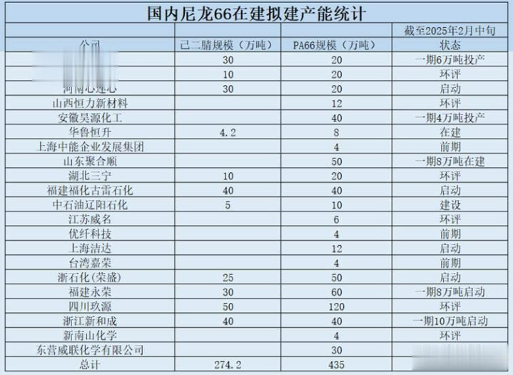 在国家政策的大力支持下,国内多家企业经长期研发取得了己二腈生产工艺的重大成果,开始了己二腈生产线的投资建设。截至2025年2月中旬的统计数据显示,国内尼龙66在建拟建产能高达435万吨,市场需求空间广阔。