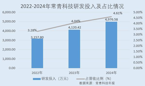 据常青科技年报数据,2022-2024年,常青科技研发投入分别为3,157.80万元、4,120.42万元、4,976.58万元,占当期营业收入的比例分别为3.28%、4.04%、4.61%。近三年,常青科技研发投入CAGR达25.54%。