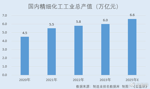 据制造业排名数据库数据,2020-2023年,国内精细化工工业总产值分别为4.5万亿元、5.5万亿元、5.8万亿元、6.0万亿元,预计2025年将达到6.6万亿元。
