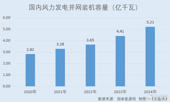 据国家能源局数据,2020-2024年,国内风力发电并网装机容量分别为2.82亿千瓦、3.28亿千瓦、3.65亿千瓦、4.41亿千瓦、5.21亿千瓦,年均复合增长率为16.59%。