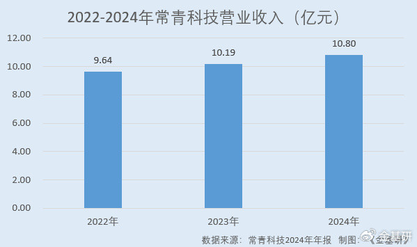 据常青科技2024年年报,2022-2024年,常青科技营业收入分别为9.64亿元、10.19亿元、10.80亿元,归母净利润分别为1.91亿元、2.13亿元、2.04亿元。