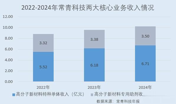 据常青科技年报数据,2022-2024年,常青科技高分子新材料特种单体业务收入分别为5.52亿元、6.18亿元、6.71亿元,高分子新材料专用助剂收入分别为3.32亿元、3.38亿元、3.50亿元。